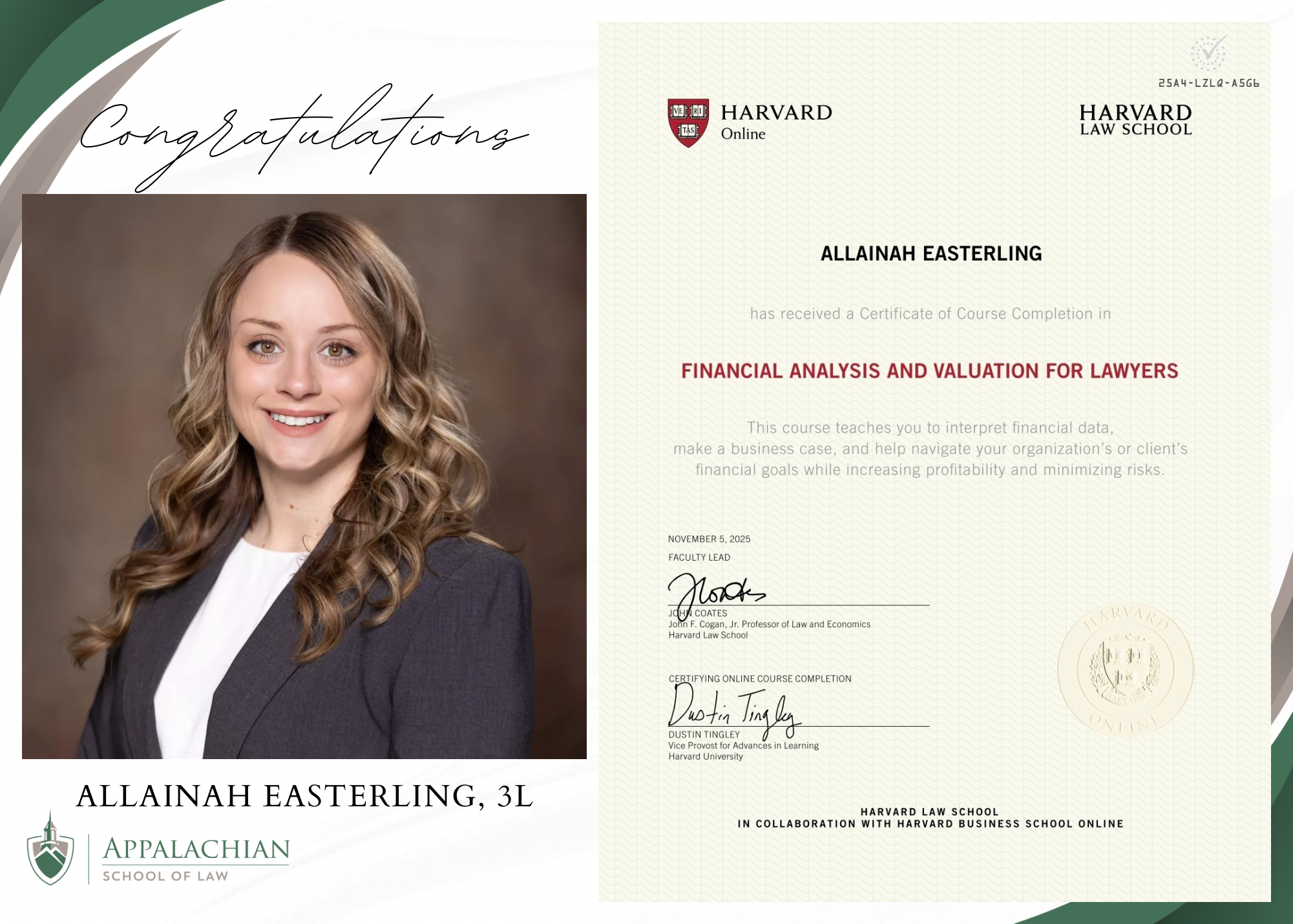 We are proud to recognize Allainah Easterling, a third-year student at the Appalachian School of Law, for earning a professional certification from Harvard Law School in Financial Analysis and Valuation for Lawyers.